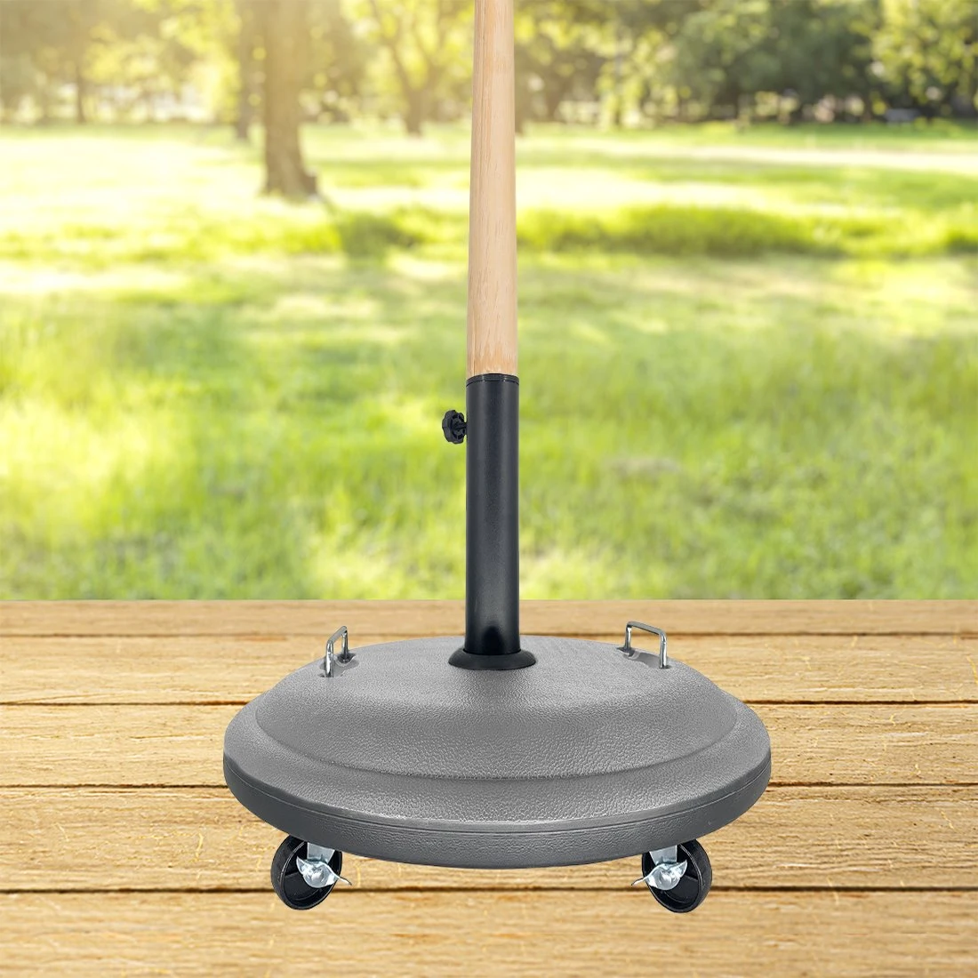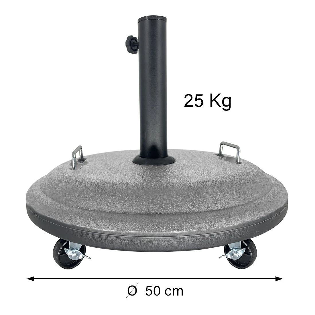 DISEÑO: Base para sombrilla ajustable con ruedas para una mayor movilidad. Incorpora una rosca ajustable en el tubo para adaptar el mástil de la sombrilla.MOVILIDAD: Es fuerte, duradera y fácil de transportar gracias a su doble asa.MEDIDAS: Pie redondo de 50 cm ø y 25kg de peso.MATERIAL: Duradero, firme y resistente al agua y a los rayos del sol, uso habilitado para interior y exteriorFÁCIL DE UTILIZAR: Ideal para asegurar la estabilidad y sujeción de tu sombrilla frente al viento.