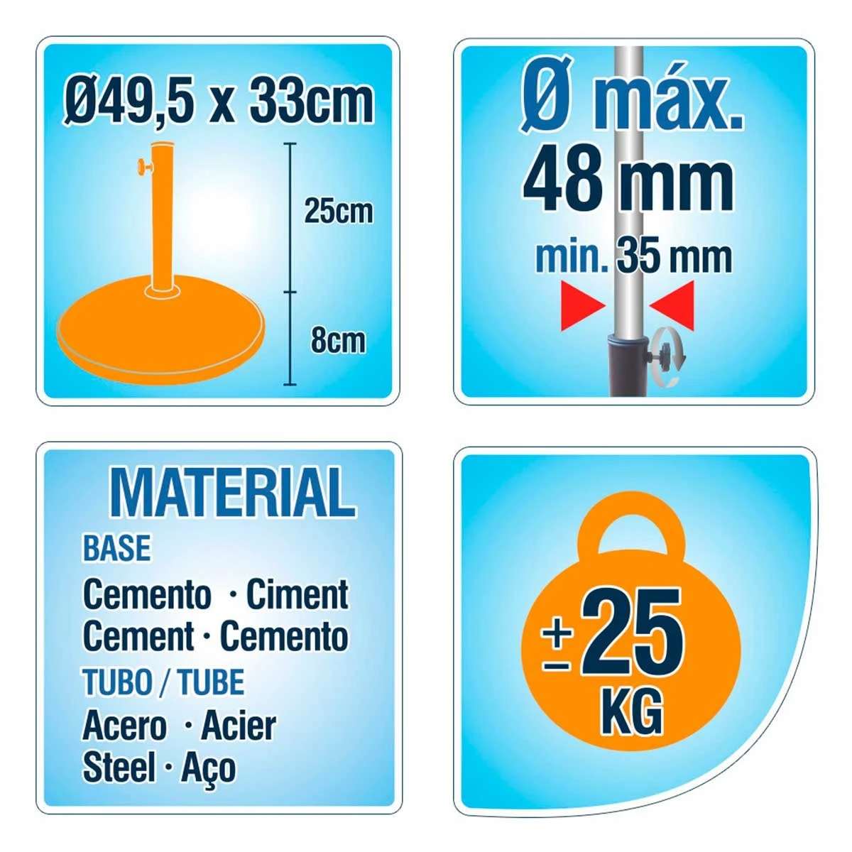Si buscas una base para sombrilla o parasol que no necesitellenar el depósito, este es tu modelo. Esta base de la marca Aktive Garden estáformada por un cuerpo de cemento y un tubo de acero. De esta manera, y graciasa sus 25kg de peso, tendrás la certeza de que tu sombrilla quedará fija sinmoverse, incluso en esos días de viento. La base viene con 2 boquillas deajuste que podrás poner o quitar dependiendo del tamaño del mástil de tusombrilla, garantizando una gran cantidad de sombrillas compatibles. Con undiseño elegante, ni el sol, ni la lluvia la deteriorarán, asegurando una granvida útil con un estado como nuevo. Este verano tú elijes cómo pasarlo, por eso, con esta base para sombrillatomarás el control del sol que tomas de una forma fácil y segura. Hazte ahoracon esta bonita y práctica base para sombrilla a un precio de chollo.