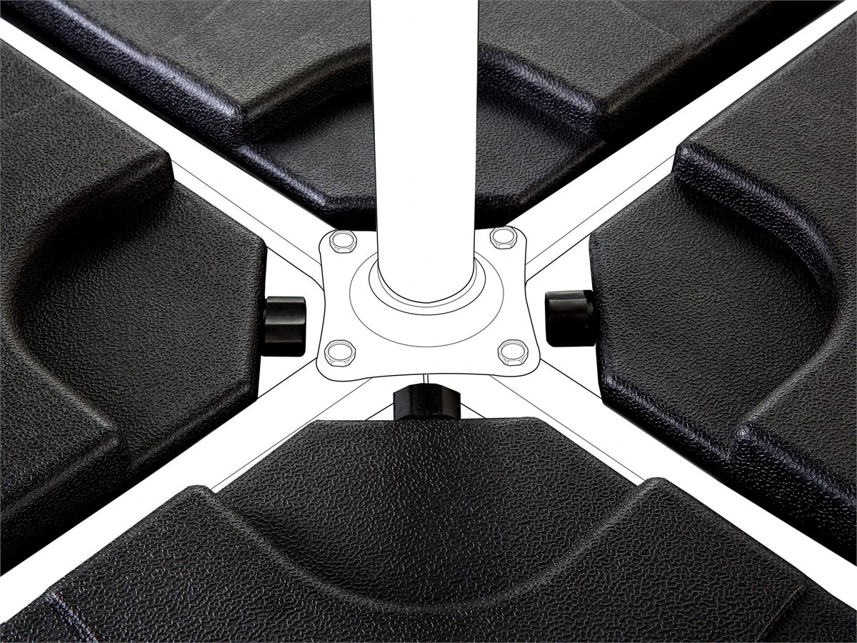 Base para sombrilla – conjunto de cuatro secciones de peso. Añade funcionalidad a tu zona exterior con esta base para sombrilla. Está fabricada a partir de material sintético resistente a los rayos UV y a condiciones climáticas adversas. Puedes rellenar cada pieza con agua o arena y ajustar el peso a tus necesidades. Detalles: Tipo de Producto: Accesorios para sombrilla Estilo: Moderno Color: Negro Tipo de material: Material sintético Material principal: Material sintético Forma: Cuadrada Recommendado para: Sombrilla sin volantes Dimensiones: Profundidad: 52 cm Ancho: 52 cm Altura: 8 cm Peso: 9 kg La oferta incluye: 1 x Base para sombrilla (4 piezas Ventajas: Gran durabilidad, Ideal para uso al aire libre, Resistencia UV, Resiste a la intemperie y a todo tipo de clima, Mantenimiento sencillo Información de montaje: Requiere montaje parcial. 5-15 min. Texto de resistencia: Gracias a su resistencia al agua, puedes utilizar el producto al aire libre y dejarlo a la intemperie durante lluvias ligeras. Si no es posible guardarlo en un lugar cerrado y protegido, recomendamos utilizar una funda protectora. La exposición prolongada a la humedad puede provocar daños en el mueble. Resistencia: Agua ligera / humedad Consejos de mantenimiento: Material sintético: 1.Manténgalo alejado de fuentes de calor, como parrilla o fuego, ya que las chispas pueden causar daños graves. No coloque utensilios calientes directamente sobre la superficie, 2.Limpiar con un limpiador a base de jabón suave y un paño suave, 3.El material es extremadamente resistente a la intemperie. Sin embargo, se recomienda utilizar una funda protectora para la temporada de invierno o, si es posible, guardar los muebles en un lugar fresco y seco.