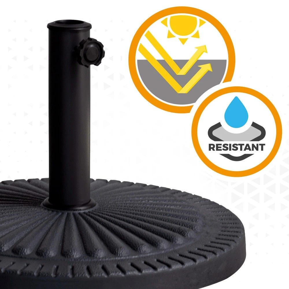 Soporte para sombrilla Aktive Garden de poliresina con medidas de 49 cm de diámetro y 33 cm de altura. La pieza pesa 14 kilos. Diseño funcional en gris oscuro y con tubo de acero. Fabricada con material resistente al agua y a los rayos de sol. Ideal para asegurar la estabilidad y sujeción de tu sombrilla frente alviento. Apto para sombrillas con mástil de 38 y 48 mm, con rosca ajustable.