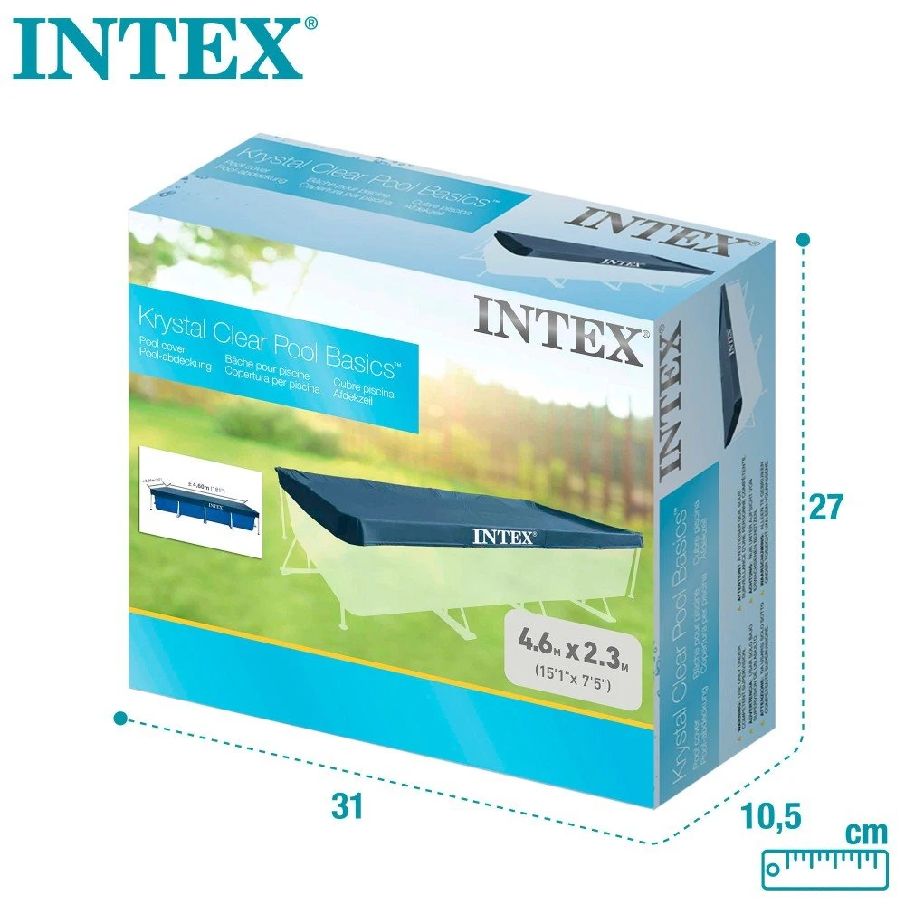 Cobertor rectangular INTEX de tamaño 460×226 cm exclusivo para piscinas desmontables INTEX Small y Metal Frame de 450×220 cm (Ref. 28272 y 28274FR. El cobertor está fabricado con vinilo resistente de 18 mm de grosor y 20 cm de voladizo. Dispone de agujeros de drenaje repartidos en la superficie para evitar la acumulación de agua de lluvia y sistema de cuerda para fijar el voladizo a la estructura.