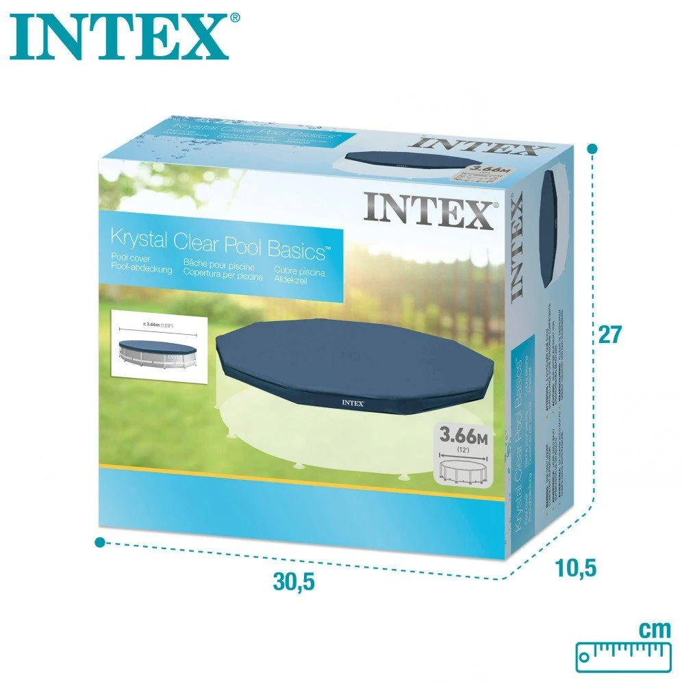 Cobertor INTEX de 366 cm de diámetro exclusivo para piscinas desmontables INTEX Metal y Prism Frame de 366×76/99 cm (Ref. 28710, 28712 y 26716. El cobertor está fabricado con vinilo resistente de 18 mm de grosor y 25 cm de voladizo. Dispone de agujeros de drenaje distribuidos en la superficie para evitar la acumulación de agua de lluvia y sistema de cuerda para fijar el voladizo a la piscina.
