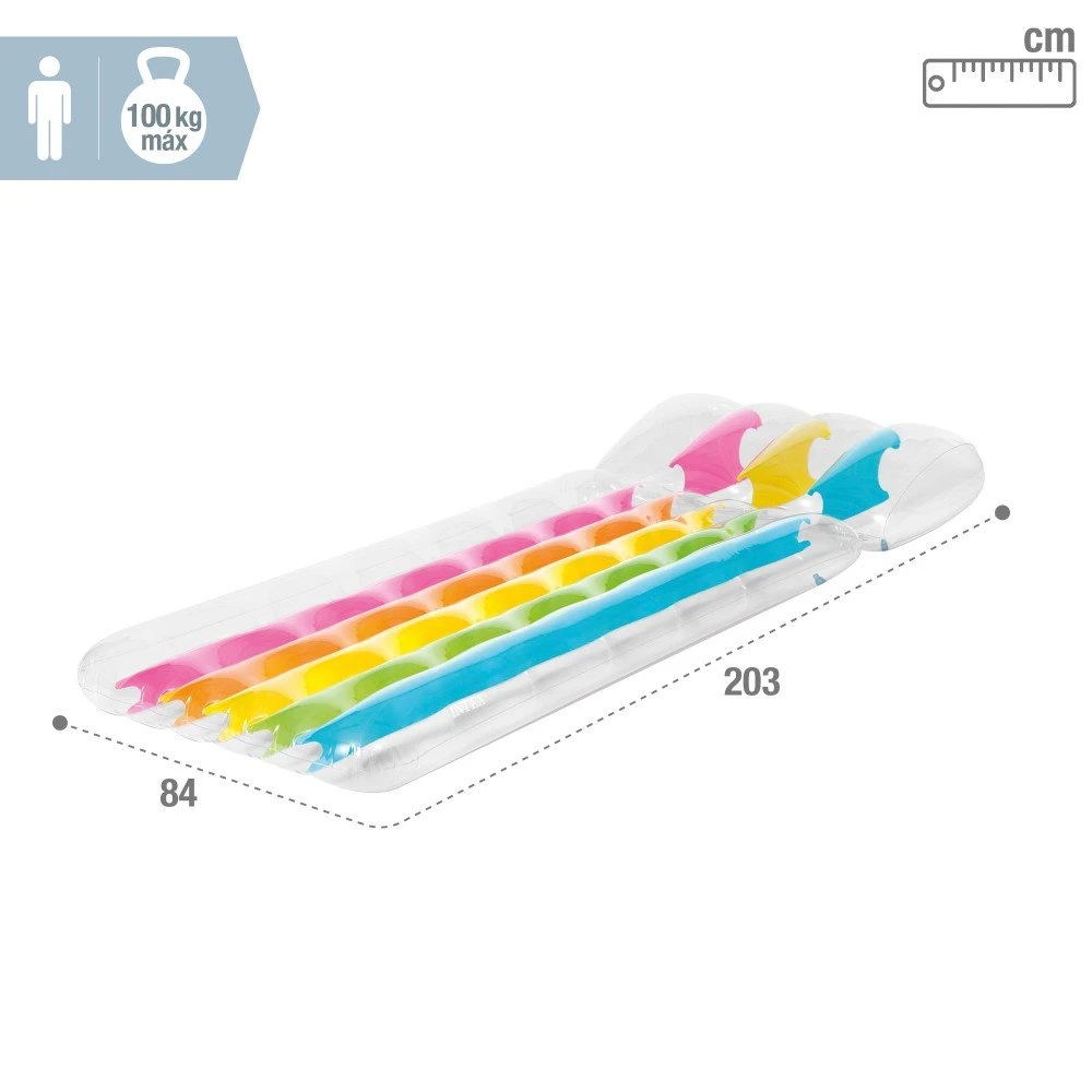 - Flota con estilo con esta colchoneta arcoíris INTEX de 84×203 cm. Perfecta para una persona a partir de 14 años (peso máximo 100 kg