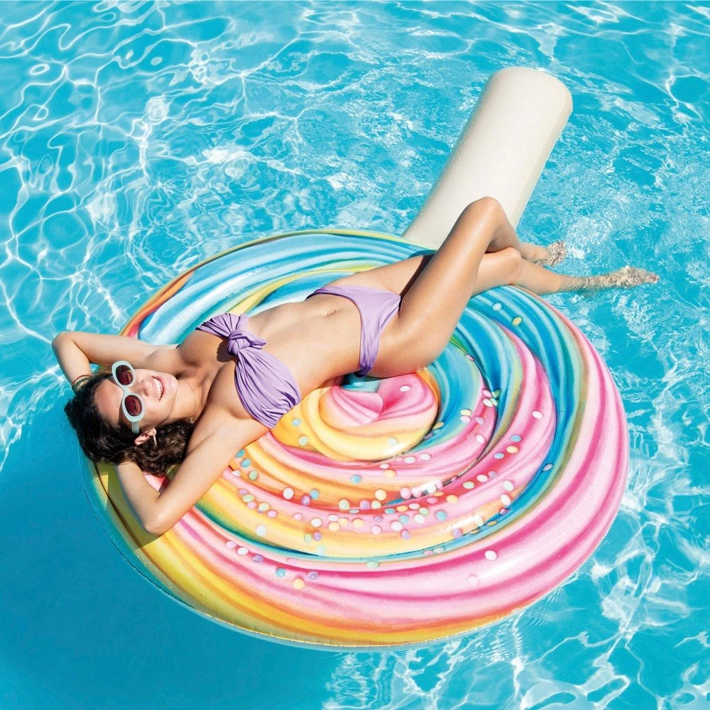 Disfruta en la playa o en la piscina con este increíble flotador hinchable con forma y diseño de piruleta multicolor. ¡El hinchable más dulce de la historia! Está fabricado de PVC resistente. Tiene capacidad para 1 persona y soporta 100 kg. Incluye parche de reparación para arreglar pequeños poros o posibles pinchazos.