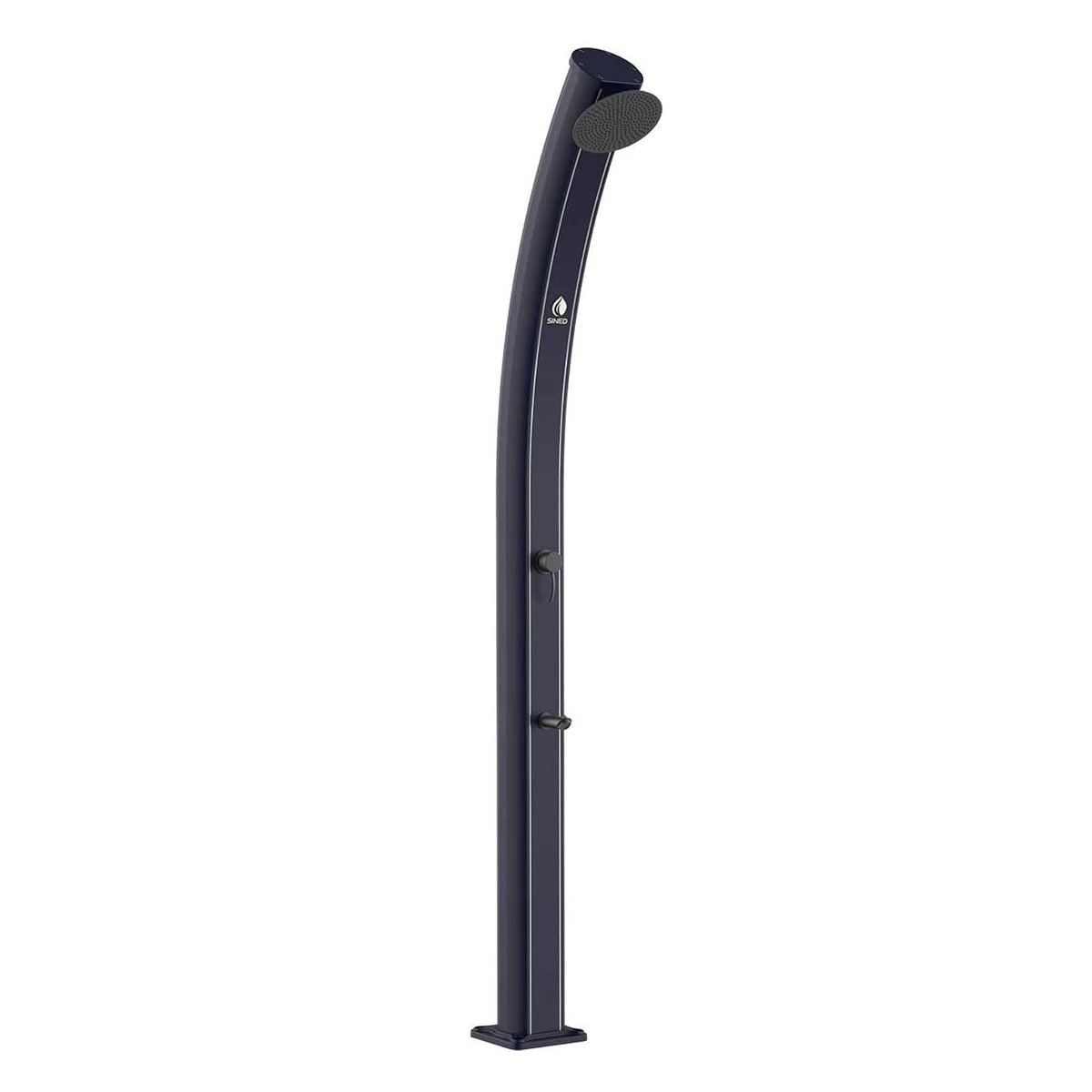 Si quiere agua muy caliente, elija entre nuestras duchas solares Sined las de color negro, gris, azul y rojo. Mucha agua caliente con energía solar, totalmente solar , sin sorpresas en la factura de la luz. La ducha azul de aluminio con calefacción solar DAFNE de SINED, tiene un depósito de 35 litros que la hace apta para su uso en lugares públicos (hoteles-campings-pueblos turísticos-establecimientos de baño y para uso privado. También es excelente para amueblar espacios exteriores. Fabricado en aluminio, para garantizar unos colores brillantes y duraderos. Equipado de serie con un cuerpo curvo, mezclador de agua caliente-fría y lavabo de pie. Recuerda que cuanto más oscuro sea el color, más te llegará el calor del sol. Colocar siempre en la zona más soleada durante el día. El chorro de la alcachofa de la ducha solar es mucho más suave que el chorro de una ducha tradicional o de un grifo, desde el lavapiés sólo sale agua fría. Altura 226 cm, diámetro del cabezal de ducha de acero inoxidable cromado 8″ 20 cm. Filtro anticalcáreo y práctica bolsa protectora, en tela de 190, para su almacenamiento, como regalo . La ducha se somete a una prueba de presión individual por inmersión en una bañera de agua, tras la cual se seca, se vuelve a comprobar y se embala cuidadosamente con una protección personalizada. Completa con – Depósito de agua de 35 litros – Altura 226 cm – Grifo de lavado de pies – Ducha redonda diámetro 8″ 20 cm acero inoxidable – Ducha con boquillas anticalcáreas – Accesorios de latón NEGRO MATE – Filtro anticalcáreo – Cartucho mezclador de alta calidad – Presión de agua recomendada 3,5 bar – Mangueras de trenzado interno 15 kg de presión – Bolsa de protección, de tela 190, para guardar el producto – Tapones de fijación suministrados – Fijación con casquillos protectores especiales de nylon Algunos consejos La fuga de agua de la alcachofa de la ducha después de cerrar el grifo no es un defecto, sino un requisito técnico. Una ducha solar no es un sistema cerrado. Si hay demanda de agua caliente, el agua fría entra en el depósito desde abajo a través de la válvula, expulsando el agua caliente que ya está en la parte superior del depósito. Todo el cuerpo de la ducha se llena de agua y actúa como calefacción solar. La presión creada por la calefacción puede escapar de la alcachofa de la ducha. Desmontaje al final de la temporada Durante el invierno, la ducha debe estar COMPLETAMENTE vacía de su contenido de agua. Además, la ducha debe desmontarse y guardarse en un lugar seco durante el invierno. El incumplimiento de esta advertencia puede provocar daños por congelación en el producto. Los daños por heladas no están cubiertos por la garantía. 1 Cierre la ducha y retire la manguera de jardín. 2 Para vaciar la ducha, gire el mezclador de nuevo a la posición «HOT» (aprox. 2 minutos y abra el tapón de vaciado. 3 Retire los tornillos de fijación de la base y vacíe el agua restante del fondo de la ducha inclinándola (¡es absolutamente necesario!. Limpieza Utilice productos de limpieza disponibles en el mercado para la limpieza. No utilice productos de limpieza que contengan disolventes, productos de limpieza abrasivos o esponjas duras, cepillos, etc.