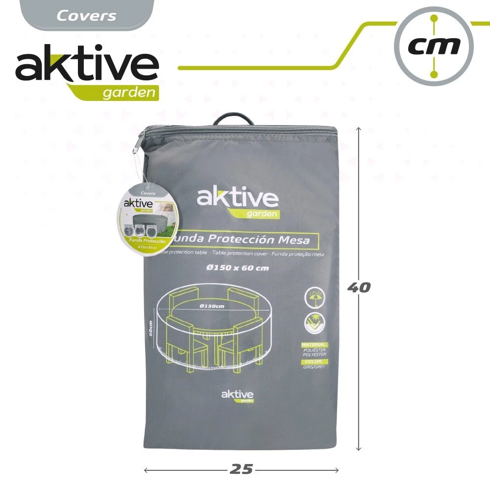 Protector impermeable para mesas redondas de jardín o terraza Aktive Garden. La funda mide Ø150 cm. Protege tus muebles al aire libre frente a la lluvia fina, el viento y los rayos del sol. Con esta funda impermeable mantendrás tu mobiliario de jardín en perfecto estado. Este modelo es de color gris y está fabricado con tejido 60% poliéster.