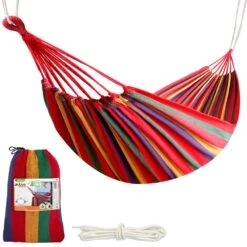 Hamaca de algodón Aktive Camping. La hamaca está fabricada con algodón de alta calidad en color rojo, lila, verde y amarillo, mide 200×100 cm, soporta un peso máximo de 200 kg y tiene capacidad para 1 persona. Incluye 1 cuerda blanca con 2 metros de largo para atar a una pared o árboles. Incluye bolsa de transporte para transportar.