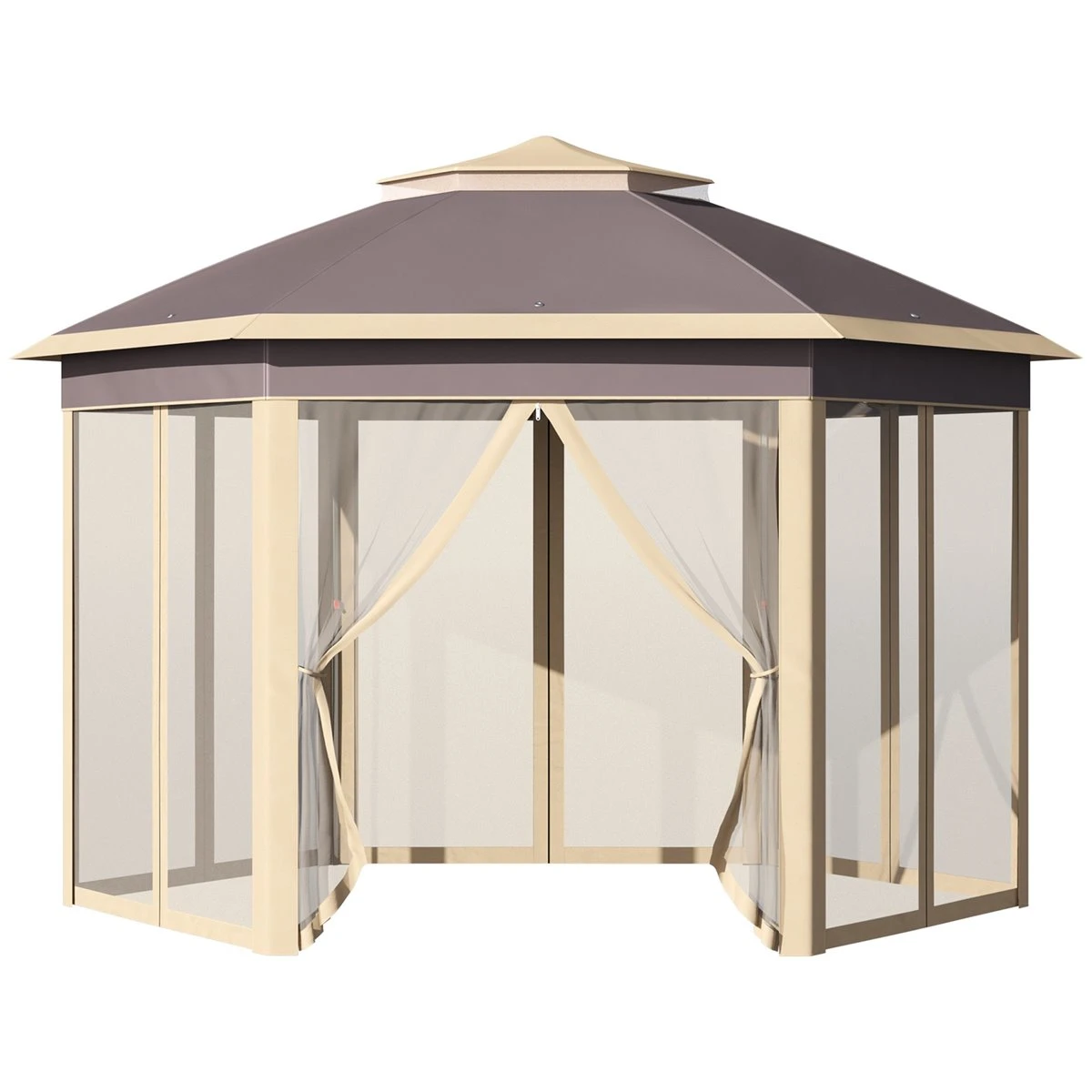 - – AMPLIO RANGO DE SOMBRA: Cenador de doble techo diseñado para proporcionar un flujo de aire y un espacio práctico en el que refugiarse del sol para relajarse, tomar una copa con los amigos o charlar con la familia. Cuenta con una estructura extendida alrededor de los aleros, lo que proporciona una cobertura de sombra aún más amplia – PORTÁTIL Y AJUSTABLE: Usa la pestaña roja en el marco de esta carpa emergente para ajustar la altura en 3 posiciones diferentes hacia arriba o hacia abajo. Al ser plegable, es fácil de guardar y transportar en la bolsa que se incluye – BUENA VENTILACIÓN: Este gazebo con mosquitera tiene 6 paneles de tela de malla, un material que ayuda a mantener alejados a los insectos y al mismo tiempo asegura un buen flujo de aire. El toldo hexagonal es de tela Oxford duradera con revestimiento de PA – RESISTENTE Y ESTABLE: La estructura de este cenador es de metal con recubrimiento en polvo para prevenir la oxidación, lo que garantiza su estabilidad y una larga vida útil. La cubierta tiene 6 orificios para drenar el agua cuando llueve y no se acumule. Incluye cuerdas de sujeción y estacas para fijar en el suelo – MEDIDAS TOTALES: 405x340x285 cm (LxANxAL. Medidas cuanto está plegado: 24x24x116 cm (LxANxAL