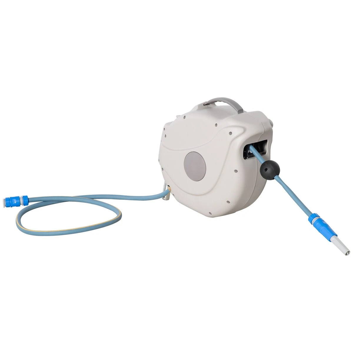 Si quieres una manguera para tu patio o jardín y no quieres estar pendiente de que se tuerza, enrolle, etc. y tener que enrollarla cuando terminas, este carrete de manguera retráctil de Outsunny es lo que necesitas. Cuenta con una manguera de 15,1 m que se enrolla automáticamente con bloqueo para fijarla en cualquier posición. Ideal para regar tus plantas, césped, limpiar tu patio, coche y más. Características – La manguera de agua de 15 metros de longitud ofrece una gran amplitud de trabajo y libertad de movimiento – Carrete de polipropileno de alta calidad, resistente a impactos y a la intemperie – Sistema de enrollado automático para mayor durabilidad y comodidad de uso – Viene con 2 cabezales intercambiables, uno tipo ducha y el otro de llenado y riego tradicional – El cabezal tipo ducha tiene 8 modos diferentes de rociado – Excelente para regar jardines, césped, patios, limpieza de vehículos y más – Incluye soporte de montaje giratorio de 180 grados y accesorios – Se requiere montaje – NOTA: Antes de recoger la manguera dentro del carrete, asegúrese de que no gotee. Guarde la manguera y el carrete en el interior durante los meses de invierno para prolongar su vida útil Especificaciones – Color: gris – Material: plástico PP (carrete y PVC (manguera – Medidas totales: 42,5x20x38 cm (LxANxAL – Longitud de la manguera de agua: 15,1 m – Diámetro de la manguera de agua: 15,5 mm – Longitud de la manguera de conexión: 1,5 m – Presión de trabajo: 3 bar – Presión de rotura: 25 bar – Temperatura de trabajo: -5-65 ℃ – Conector rápido: Ø8,76 mm – Referencia: 845-731