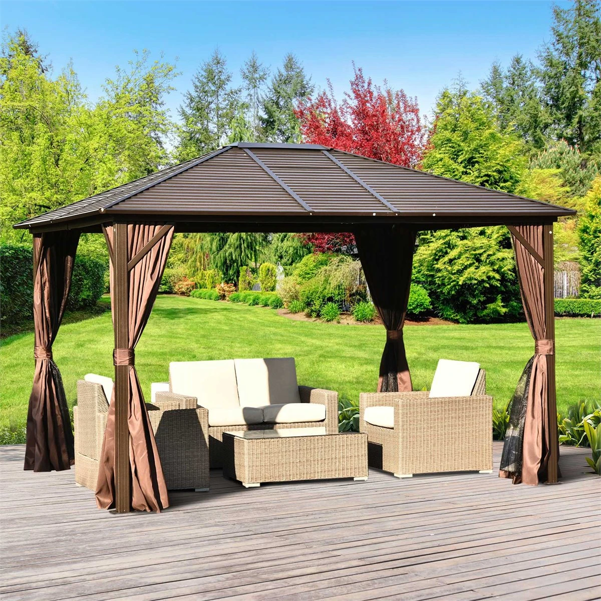 - – MARCO DURADERO: El techo están recubiertos de polvo. La estructura antioxidante de aluminio y el techo galvanizado de metal son muy sólidos y perdurables, lo cual le protege de la oxidación y las inclemencias del tiempo. – DISEÑO ESPACIOSO: Es suficientemente amplio para que tú y tus amigos hagáis reuniones sin con total comodidad. – LATERALES PROTEGIDOS: Cuenta con dos cortinas una de tela mosquitera perfecta para disfrutar del aire libre a la vez que te proteges de los mosquitos y otra opaca de poliéster para tener una mayor intimidad. Se cierran mediante cremalleras. – RESISTENTE Y ESTABLE: Alrededor del techo incorpora una barandilla de metal para ofrecerte un soporte adicional. – DIMENSIONES TOTALES: Altura del suelo al extremo superior de la carpa: 262 cm, 3m de largo y 3.65m de ancho. Altura del suelo al alero: 195 cm.