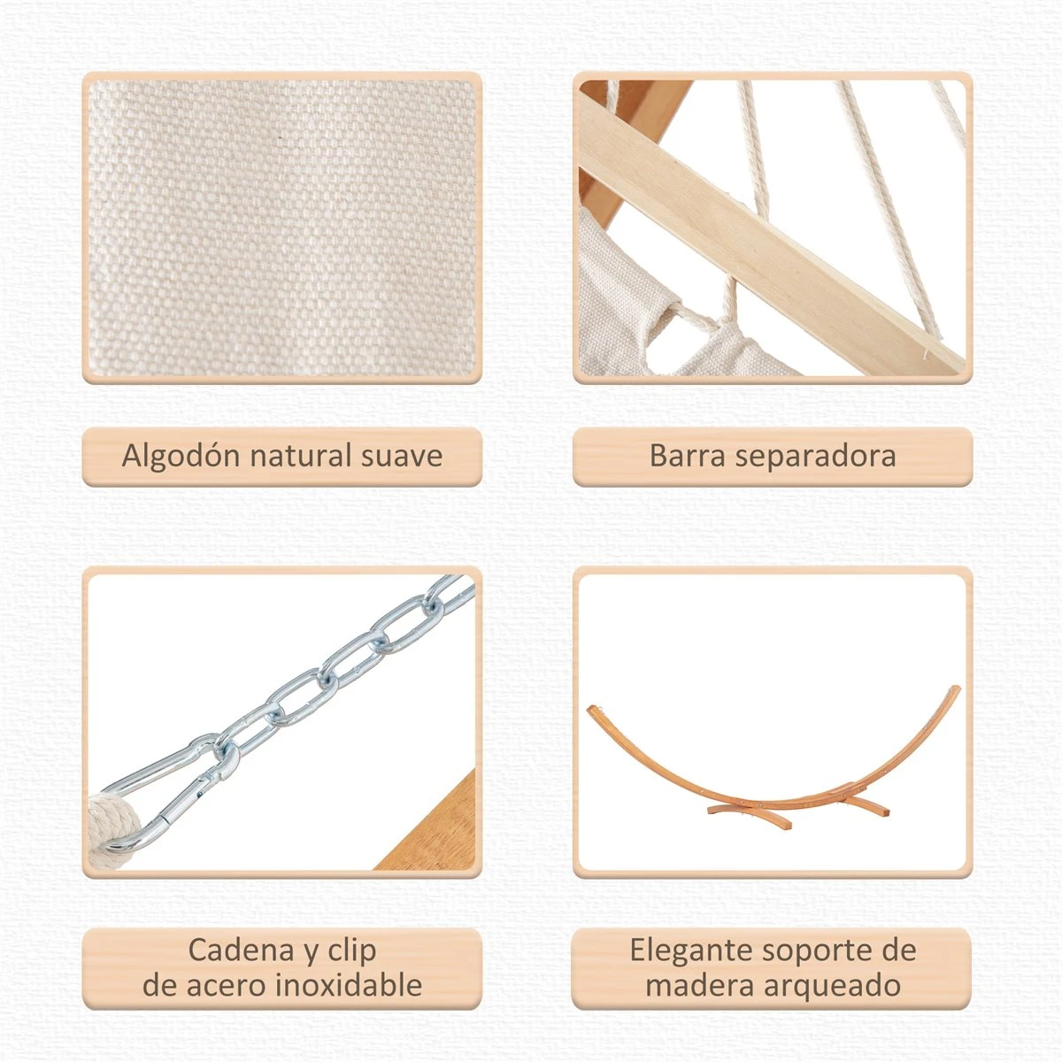 ¿Te encanta tumbarte a descansar o echarte una siesta al aire libre? ¿Te gustaría hacerlo a partir de ahora en una cómoda hamaca? Entonces esta hamaca con soporte incluido de Outsunny te va a encantar. Con tejido de algodón es suave al cuerpo y gracias al soporte de madera de alerce ya no necesitarás tener cerca un árbol ni ningún otro tipo de anclaje para disfrutar de tu descanso. Además, gracias al diseño de media luna, dará un toque de elegancia y modernidad allá donde la coloques. Características – Hamaca con soporte con diseño de arco de media luna de madera elegante y contemporáneo que no pasará desapercibido – Amplia hamaca de algodón incluida para una cómoda experiencia de descanso – Para mayor estabilidad al balanceo y resistencia, la hamaca va colgada por ambos extremos a barra de madera que la mantiene tensada – La estructura de madera de alerce, ofrece un soporte fuerte, seguro y preparado para resistir a la intemperie – Con 4 cuerdas para conectar el tejido a la estructura por los laterales y garantizar un balanceo seguro – Se requiere montaje Especificaciones – Color: natural y blanco – Material: madera de alerce, tejido de algodón de 240 g/m² – Medidas totales: 392x120x102 cm (LxANxAL – Medidas del tejido de la hamaca: 200×120 cm (LxAN – Carga máxima: 150 kg – Referencia: 84A-130V01WT