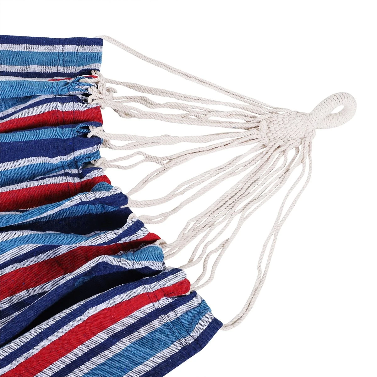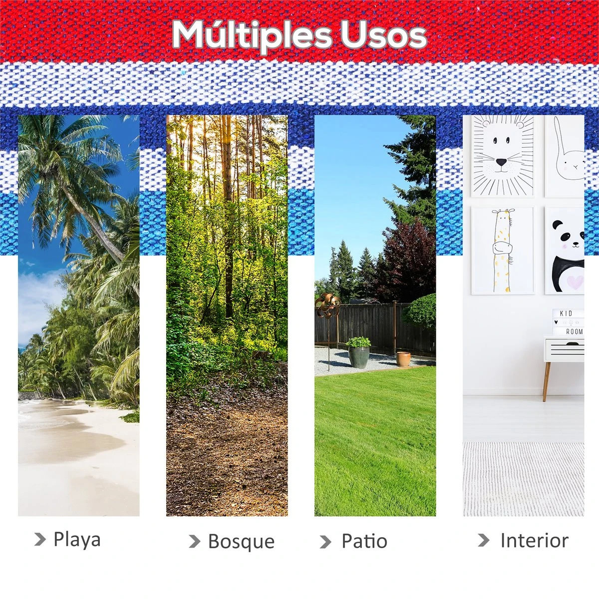 ¿Has visto esta hamaca de rayas multicolores de Outsunny? Ideal para disfrutar de una tarde tomando el sol o relajarte con un buen libro a la sombra de los árboles o en un soporte para hamacas (no incluido. Confeccionada en tela de algodón 100% con fuertes nudos de cuerda a cada lado, soporta hasta 180 kg y es lavable a 30ºC. Características – Hamaca de diseño moderno y actual con estampado de rayas multicolores – Tejido de algodón 100% para mayor comodidad y absorción de la humedad – Hamaca espaciosa ideal para descansar, leer o echar una siesta al aire libre – Para uso interior y exterior, apta para llevar de acampada, al camping o cualquier otro espacio al aire libre o que cuente con un soporte para su colocación – Fácil de instalar y como es plegable también podrás guardarla fácilmente en cualquier lugar – Este producto incluye solo el tejido de la hamaca, NO incluye soporte, ganchos ni cuerdas de fijación – Tejido resistente y lavable a 30°C – Consejo: Tumbarse en diagonal para una mejor postura de la espalda Especificaciones – Color: rayas azul y rojo – Material: 100% algodón – Medidas de la tela: 210×150 cm (LxAN – Longitud total: 3,1 m – Peso máximo soportado: 180 kg – Referencia: 01-0125