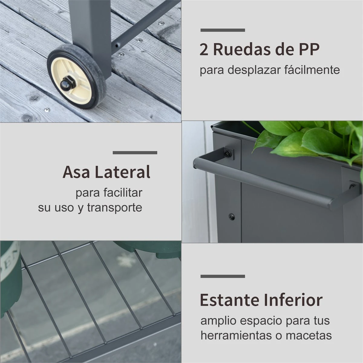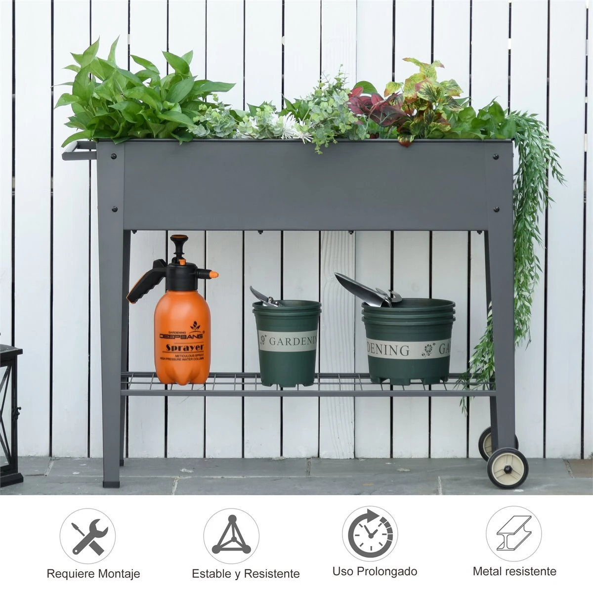 - – AMPLIA Y CÓMODA: Esta jardinera elevada de metal proporciona un amplio espacio para plantar a una altura adecuada para no hacer esfuerzos y evitar malas posturas – CON RUEDAS Y ASA: Cuentas con 2 ruedas en uno de los lados y un asa de transporte. Para mover con facilidad y transportar tus plantas fácilmente – ESTANTE INFERIOR RESISTENTE: Para que tengas todas las herramientas para el cuidado de tus plantas y cultivos a mano, soporta hasta 15 kg de peso – DECORATIVO Y VERSÁTIL: Este carrito para plantas es muy práctico a la vez que decorativo. Adecuado para plantar varias plantas, flores o hierbas aromáticas en tu jardín, patio, terraza, etc. – MEDIDAS TOTALES: 104x39x80 cm (LxANxAL; Medidas interiores de la jardinera: 95x35x20 cm (LxANxAL; Capacidad máxima de carga: 50 kg (total y 15 kg (estante inferior