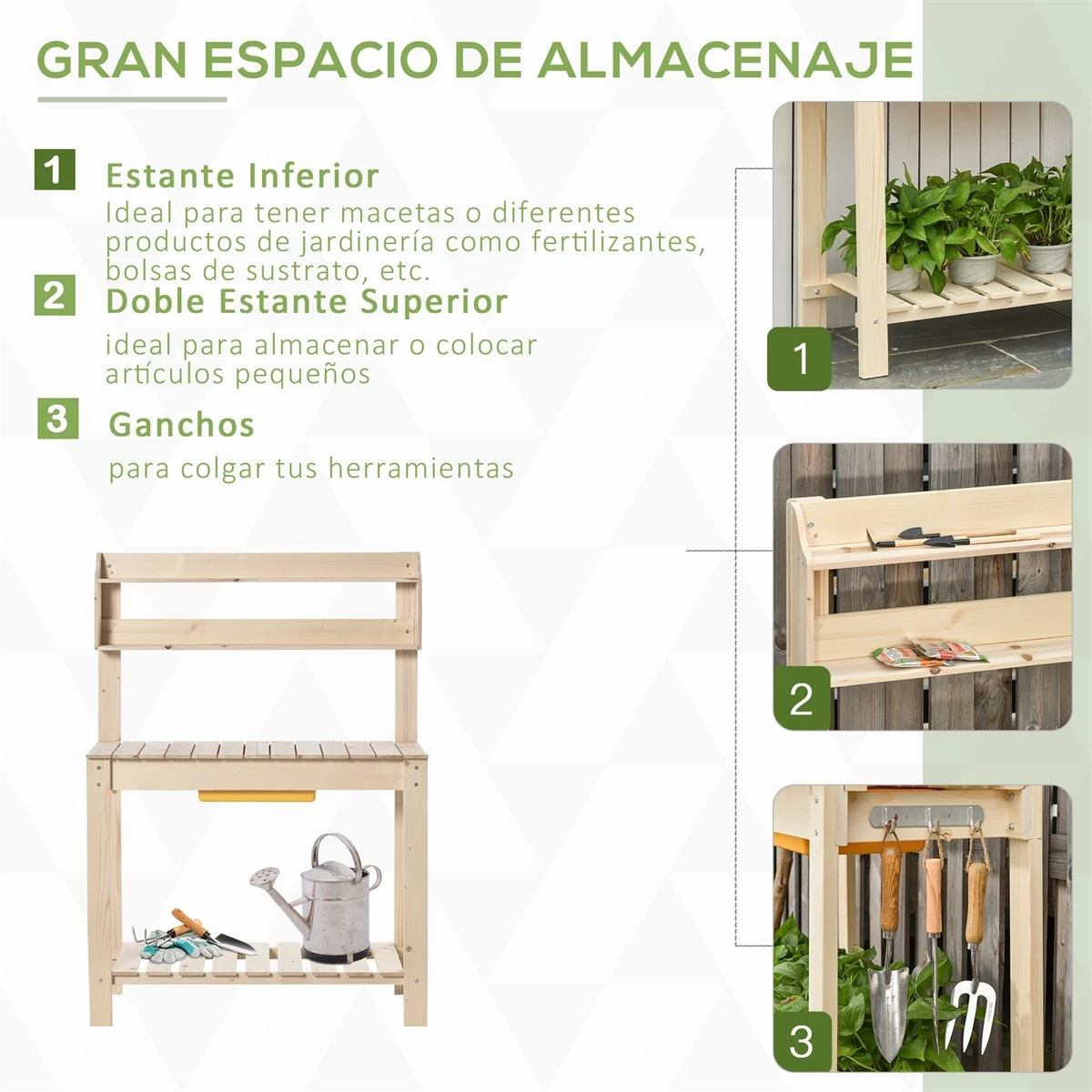 ¡Echa un vistazo a esta mesa práctica y agrega algunas comodidades simples a tu vida!¿Has visto esta mesa de plantación de Outsunny? Hecha de madera de abeto macizo y resistente, es ideal para usar tanto en interior como exterior. Para tener en el jardín, terraza o en el garaje. Su amplio espacio con estantes tanto superiores como inferior, la hacen ideal para usar como mesa para tus macetas o mesa de trabajo. En uno de los laterales tiene ganchos para colgar y tener a mano tus herramientas.