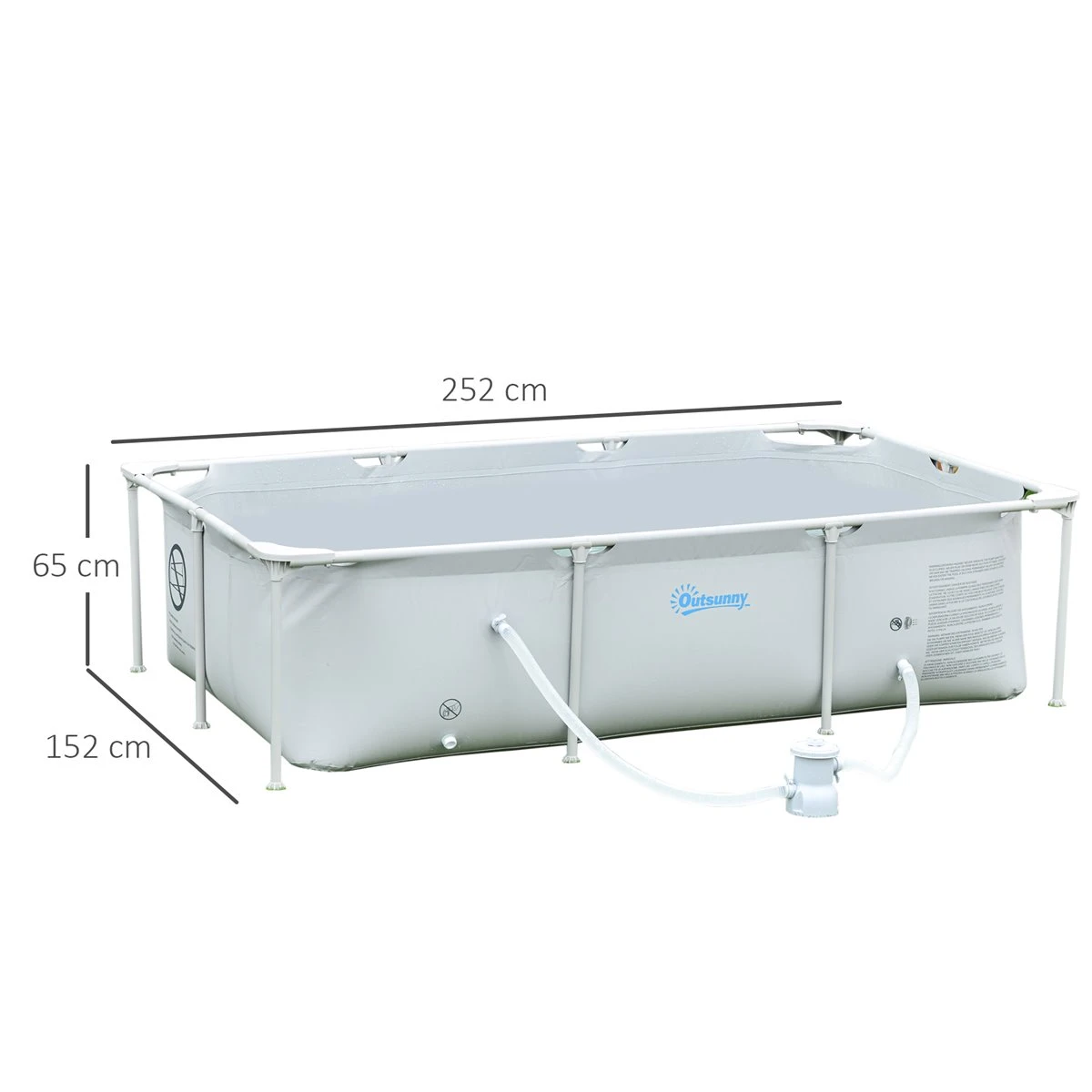 Olvídate de pasar calor este verano gracias a las piscinas de Outsunny. Combate el bochornoso sol y diviértete en compañía de tu familia o amigos. Nuestras piscinas incluyen una depuradora de filtro de cartucho, para que puedas tener tu agua limpia de impurezas. Y están hechas con marco tubular de acero resistente y paredes reforzadas de PVC de alta densidad, para resistir a los rayos UV y a los impactos que puedan producirse mientras te diviertes en ellas ¡Disfruta del verano con Outsunny! Características – Recomendado para adultos y niños de todas las edades – Incluye depuradora de cartucho para depurar el agua y mantenerla limpia y libre de impurezas – Marco tubular de acero con recubrimiento, para mayor resistencia a la intemperie y a la corrosión – Las patas de la piscina cuentan con bases anchas para proporcionar una gran estabilidad y firmeza, y evitar que vuelque – Piscina con paredes laterales de PVC reforzado – Se requiere montaje Especificaciones – Color: gris – Material: PVC 1000D y acero – Medidas totales: 252x152x65 cm (LxANxAL – Medidas del interior: 243x146x65 cm (LxANxAL – Medidas de la válvula: Ø3×5,2 cm (DxAL – Diámetro de los tubos de acero: Ø32 mm y Ø28 mm – Capacidad máxima: 2163 L – Longitud de los tubos de la depuradora: 100 cm – Longitud del cable: 220 cm (cable de la depuradora – Voltaje: 230 V/50 Hz – Corriente: 0,14 A – Potencia: 12 W – Capacidad de filtración: 1200 litros/hora – Certificaciones: CE-EMC, LVD, RoHS y EN71-3 – Referencia: 848-016V90GY
