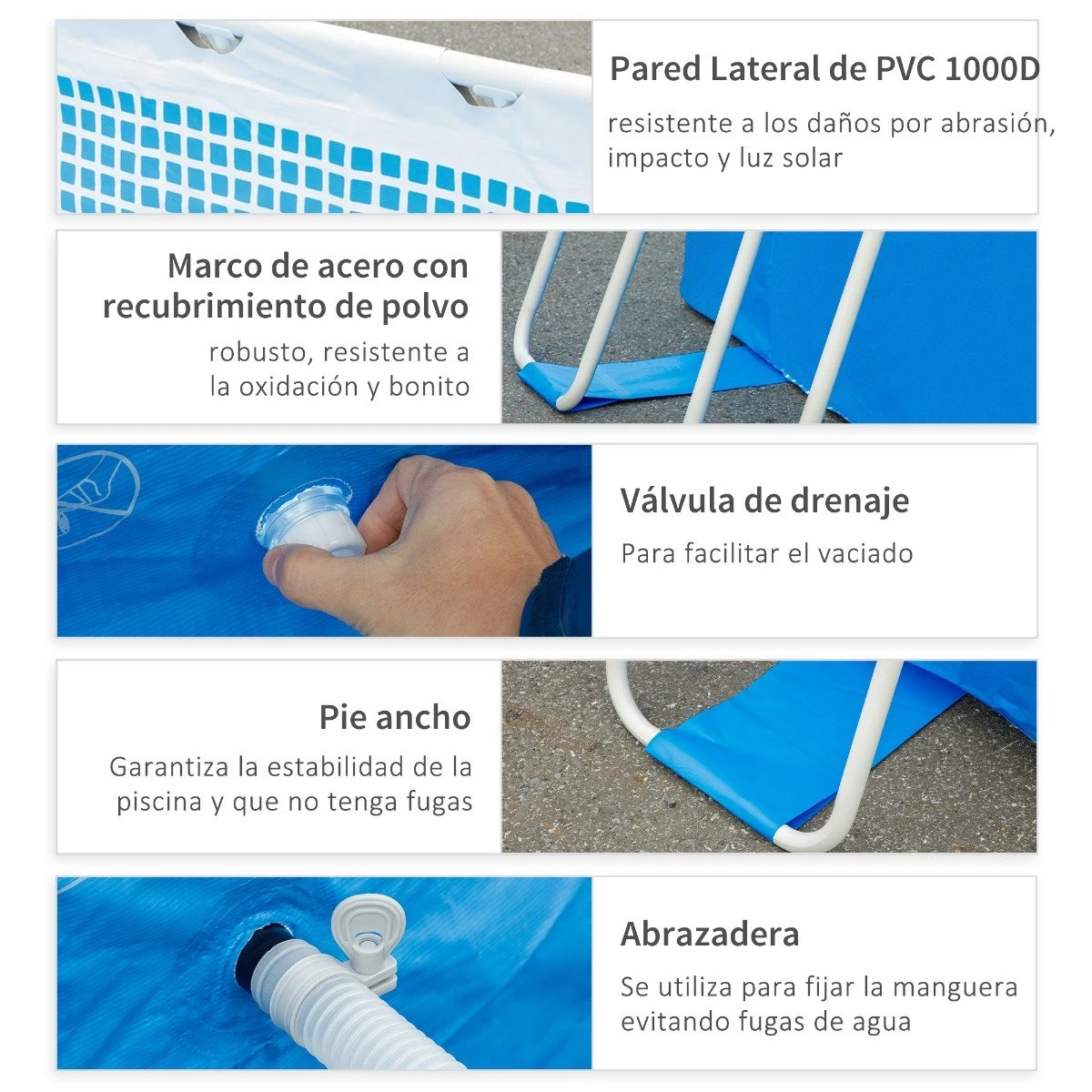 - – Las patas de la piscina cuentan con bases anchas para proporcionar una gran estabilidad y firmeza, y evitar que vuelque
