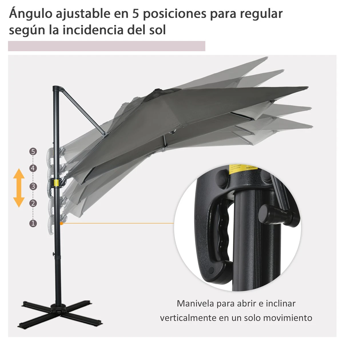 Si buscas una sombrilla con soporte excéntrico, esta de Outsunny te gustará. Con estructura de metal y aluminio con 8 varillas, tiene un toldo que ofrece gran protección y se abre y cierra con manivela. Su techo, con ventilación, permiten que el viento y el aire fluyan más fácilmente. Pero lo mejor de todo es que es ajustable en ángulo, y cuenta con una base cruzada con soporte giratorio, que permite girarla hasta 360º para que puedas mover su orientación sin tener que cambiarla de lugar. Características – Sombrilla de grandes dimensiones para una mayor cobertura y protección solar – Sombrilla con poste lateral, también conocida como parasol excéntrico o sombrilla Cantilever – El tejido del toldo con ventilación permite que el viento y el aire cálido fluyan más fácilmente – Apertura fácil y rápida mediante manivela lateral – Poste de aluminio con 8 varillas de conexión para mayor resistencia y estabilidad – Mástil giratorio de 360 ° para orientar el toldo en cualquier dirección sin tener que mover la base – Con techo basculante con ángulo ajustable de 5 posiciones – Apta para usar en espacios exteriores al aire libre como jardín, terraza, patio, etc. – Incluye base cruzada, pero requiere pesos adicionales (no incluidos – Se requiere montaje Especificaciones – Color: gris – Material: aluminio, metal, tejido de poliéster (200 g/m² y policarbonato (PC – Medidas totales: 245x245x245 cm (LxANxAL – Medidas de la base cruzada: 100x100x4 cm (LxANxAL – Longitud de las varillas: 174 y 125 cm (largas, 63 y 61 cm (cortas – Especificaciones de las varillas: 22x13x0,5 mm (LxANxAL – Referencia: 84D-051V00GY