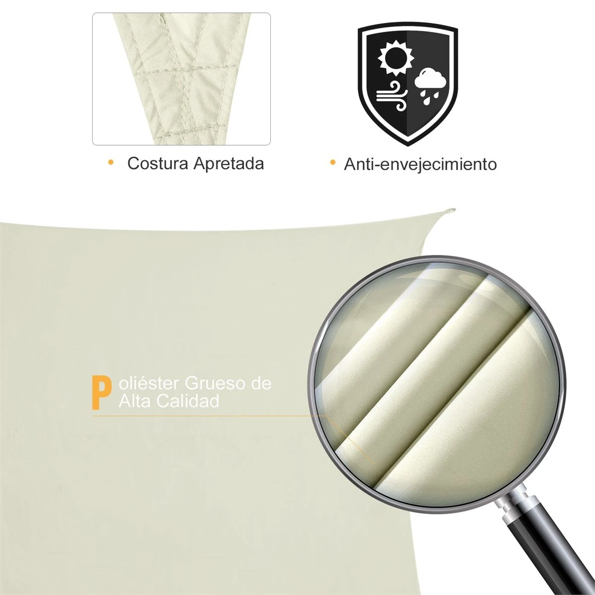 ¿Quieres protegerte del sol en tus zonas de exterior? Este toldo vela es una solución eficaz y elegante que se adapta a la mayoría de los espacios exteriores. Es discreto y fácil de montar y desmontar según tus necesidades. Ideal para el patio, la terraza, el jardín, la piscina, áreas de picnic, de juego para niños, incluso para sombrear calles o ferias. Este toldo está hecho de polietileno, un tejido resistente al moho y al desgaste. Los toldos vela de Outsunny proporcionan un 90% de protección contra los rayos UV, te ofrecen sombra y una reducción de la temperatura permitiendo estar fresco al aire libre. Disfruta de los espacios exteriores en primavera y verano con estas velas de sombra.