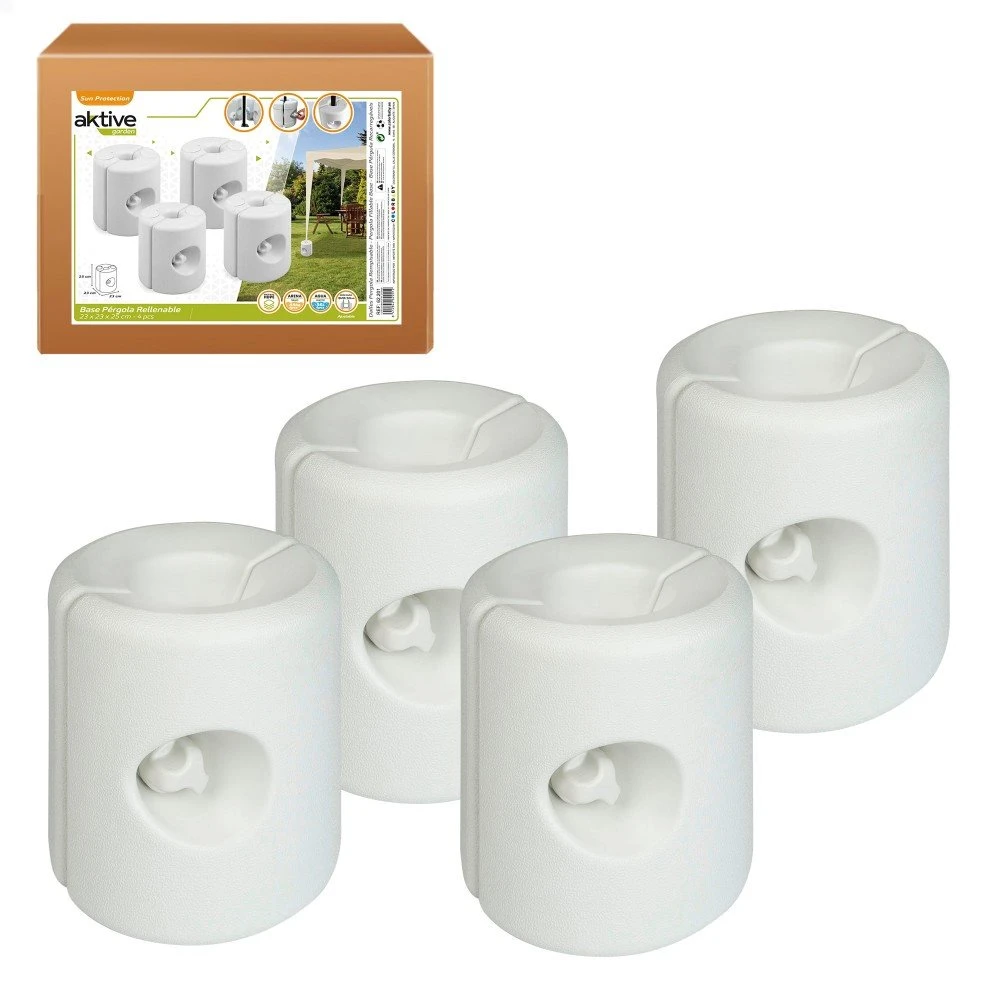 Pack de 4 soportes para carpas y pérgolas Aktive Garden en color blanco. Los pesos son compatibles con tubos de 22 a 38 mm de grosor y están fabricados con polietileno de alta densidad. Cada peso tiene un tornillo para ajustarlo al mástil y se puede rellenar con 9 litros de agua (36 litros en total o con 11 kg dearena (44 kg en total. Cada pieza mide 23x23x25 cm y son de fácil montaje.