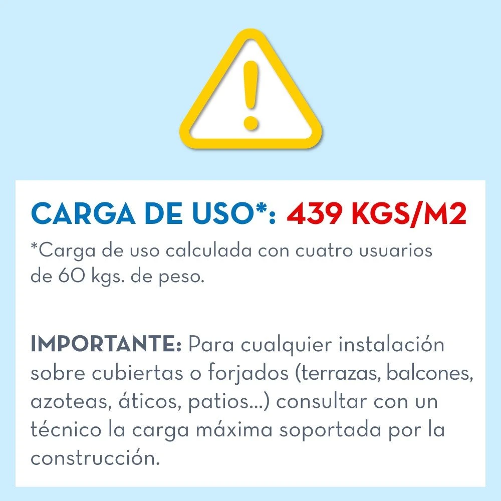 - Este modelo de piscina elevada no incluye depuradora pero sí las conexiones para adaptársela (de 32 mm de diámetro