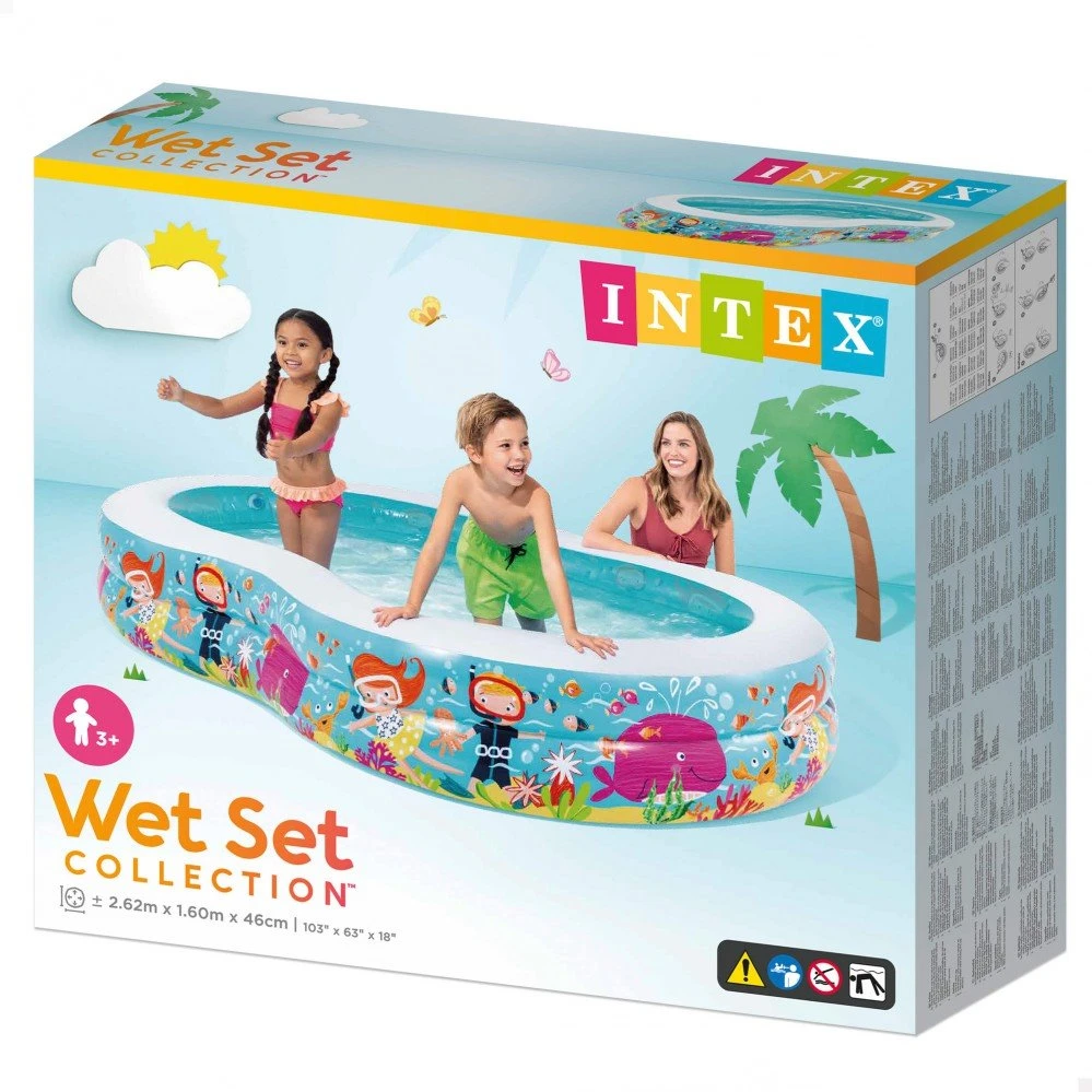 - Piscina hinchable INTEX de la línea Paradise Pool con ilustraciones del fondo del mar con plantas marinas, peces de distintas formas y colores y niños buceando