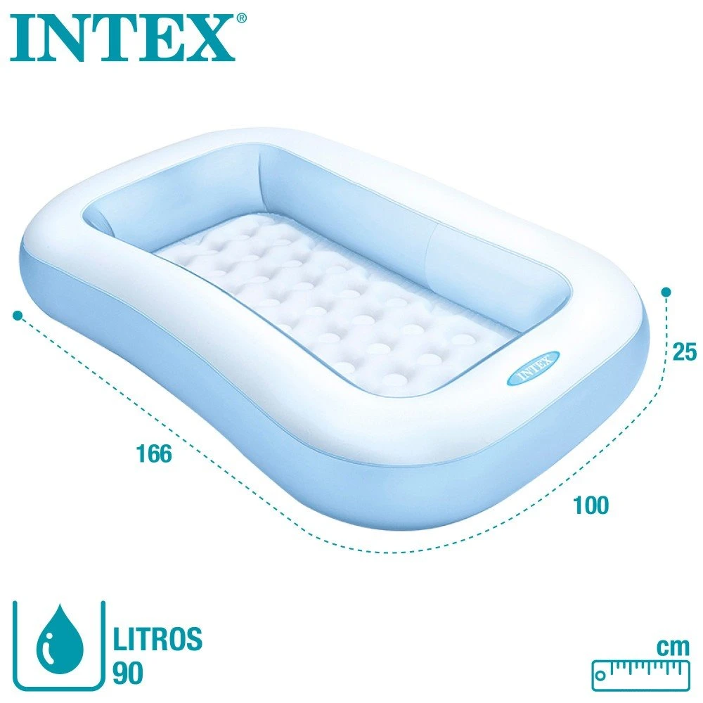 - Piscina hinchable Intex rectangular de la línea SmallPools, medidas: 166x100x25 cm y capacidad para 90 litros de agua
