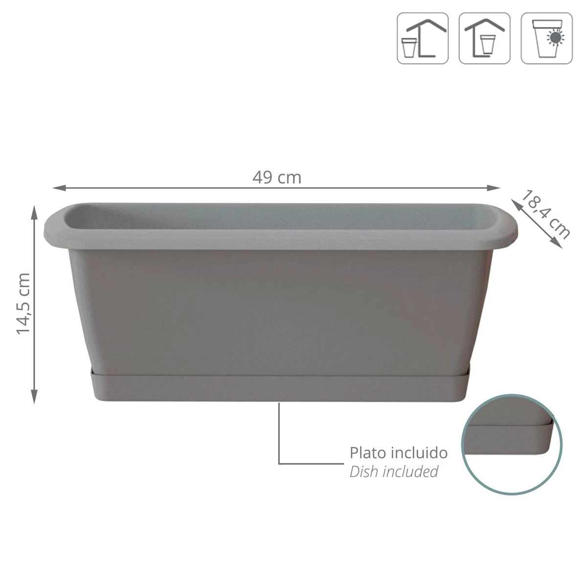 Los amantes de los diseños minimalistas y atrevidos suelen buscar soluciones sencillas y originales.La colección Respana es una respuesta perfecta a estas necesidades, ya que combina funcionalidad con una línea elegante.Toda una serie de modelos y el uso polifacético de los mismos permiten crear una variedad de composiciones efectivas, convirtiéndolas en un fuerte detalle de arreglo.La serie está equipada con soportes con sistema de autobloqueo o colgantes, disponibles en una amplia gama de colores más vendidos.- Alta resistencia de la maceta a las heladas y a la intemperie.- Mano de obra con diseño de alta calidad.- Soporte / Plato incluido.- Fácil de limpiar. Dimensiones: 49 (largo x 18,4 (ancho x 14,5 (alto cm.