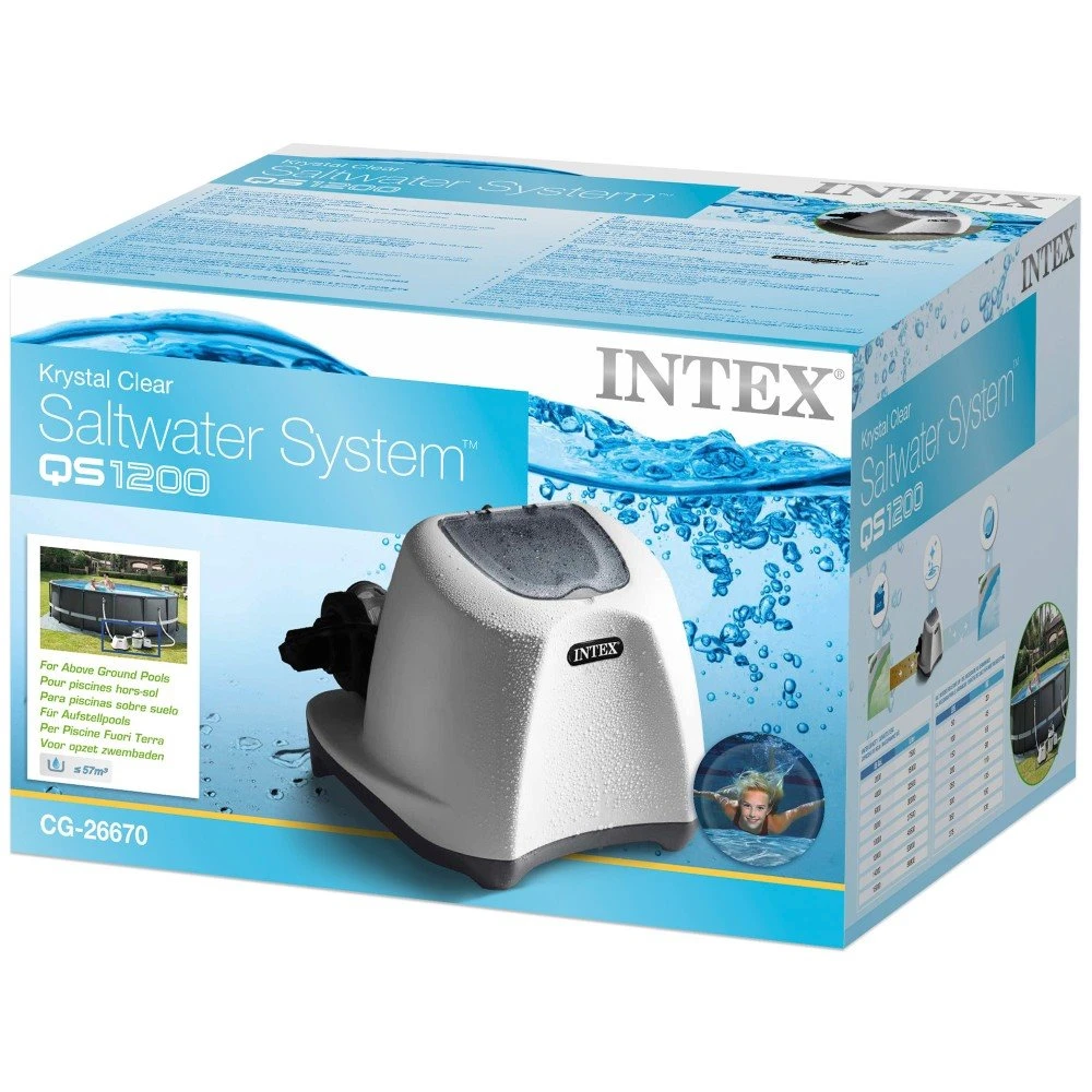 Sistema de cloración salina ECO para piscinas desmontables INTEX de hasta 56.800 litros. Produce 12 gramos de cloro natural cada hora. Compatible con depuradoras con capacidad de filtración entre 2.650 y 12.112 litros/hora. Panel de control con 4 botones LED, función de programación de 12 horas, potencia de 125 W y funcionamiento por tecnología de 2 etapas. Ecológico, económico y saludable.