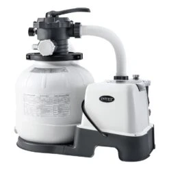 - Sistema de depuración INTEX, combina cloración salina y filtración por arena, indicado para piscinas elevadas de hasta 32.200 litros, potencia motor 0,3 hp