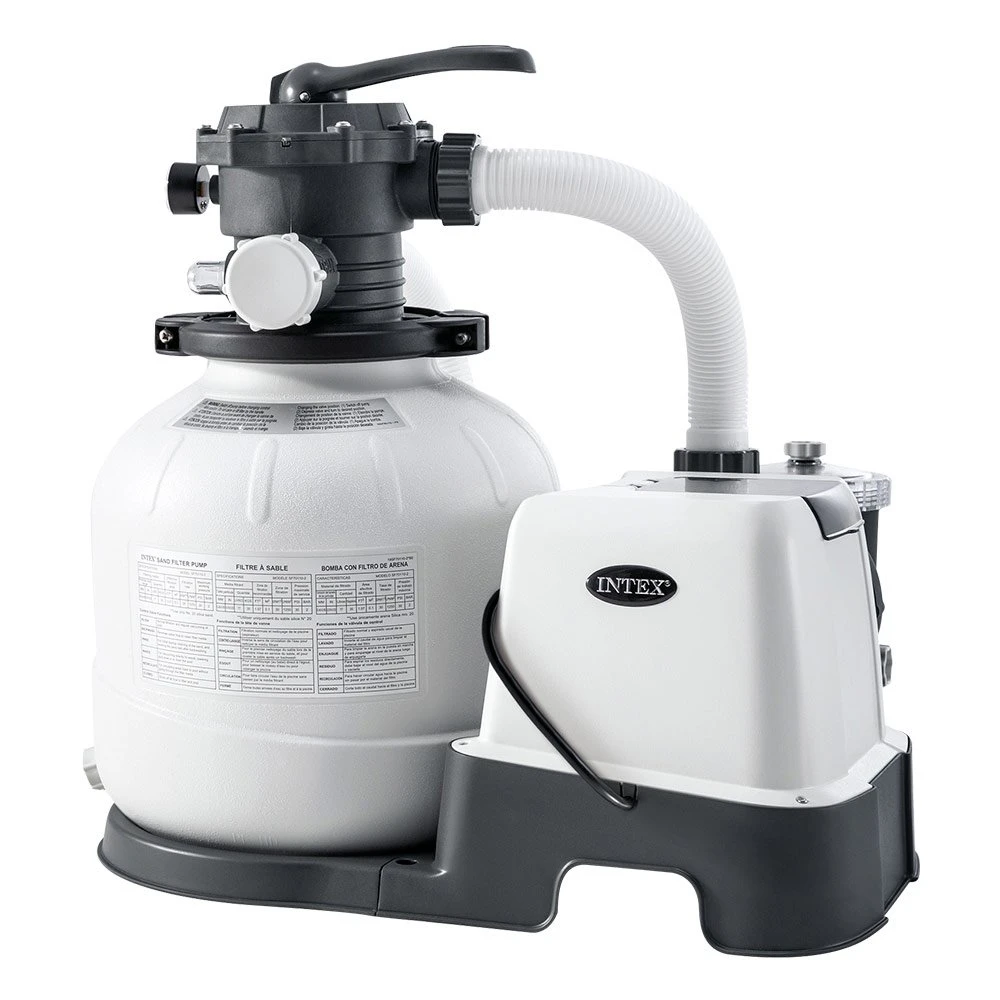 Sistema combinado INTEX formado por depuradora de arena 6.000 l/h y sistema de cloración salina 7 g/h. Indicado para piscinas desmontables de hasta 32.000 litros. Incorpora 6 funciones, panel digital con programador de 24 h y tanque con capacidad para 35 kg de arena o 25 kg de arena de vidrio. Adecuado para piscinas con conexiones de 38 mm. Cuenta con sistema Hydro Aeration Technology.