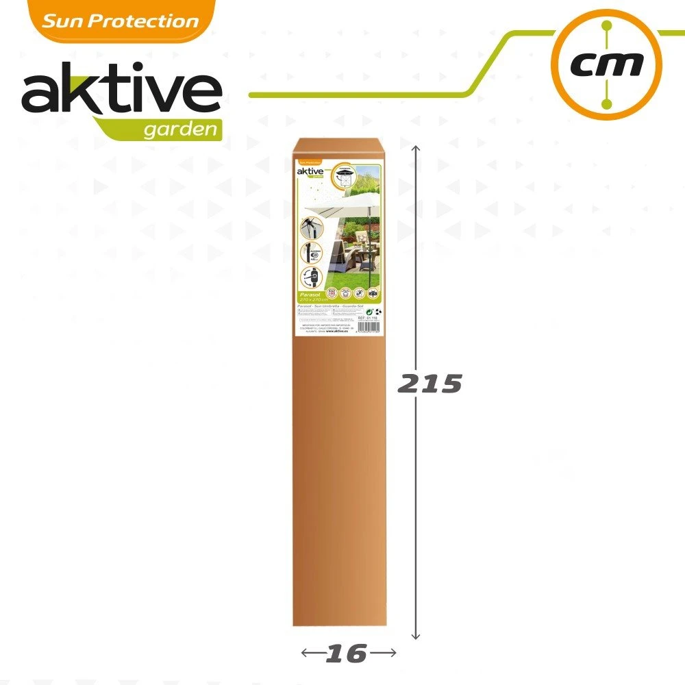 Parasol cuadrado color crema Aktive Garden, ideal para protegerse de los rayos del sol durante todo el año. La sombrilla mide de 300 cm de ancho y 300 cm de largo y la altura del mástil es de 2,7 metros. Tiene una estructura de aluminio color antracita con mástil fijo de 48 mm de diámetro y 8 varillas que dan soporte a la tela. El tejido está fabricado de poliéster de 160 gramos y cuenta con protección UV50 para proteger de los rayos del sol. El mástil tiene una manivela para abrir y cerrar la sombrilla fácilmente. Incluye un sistema de chimenea antiviento en el techo para facilitar la circulación del aire en días de viento moderado y para ayudar a evitar la acumulación de calor en su interior.