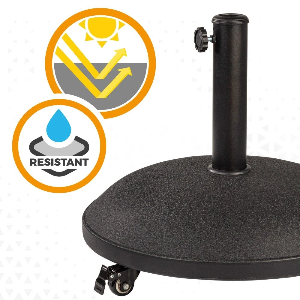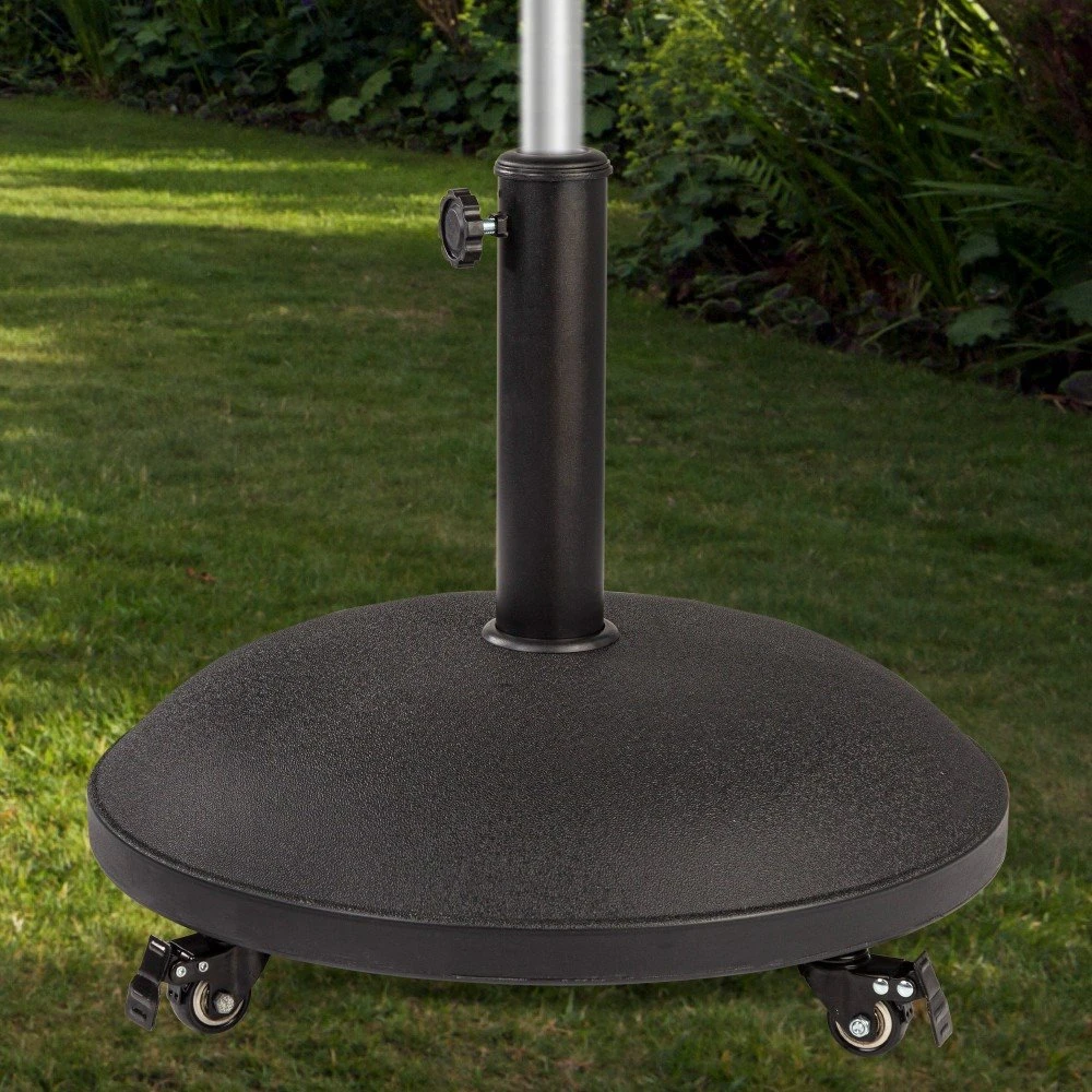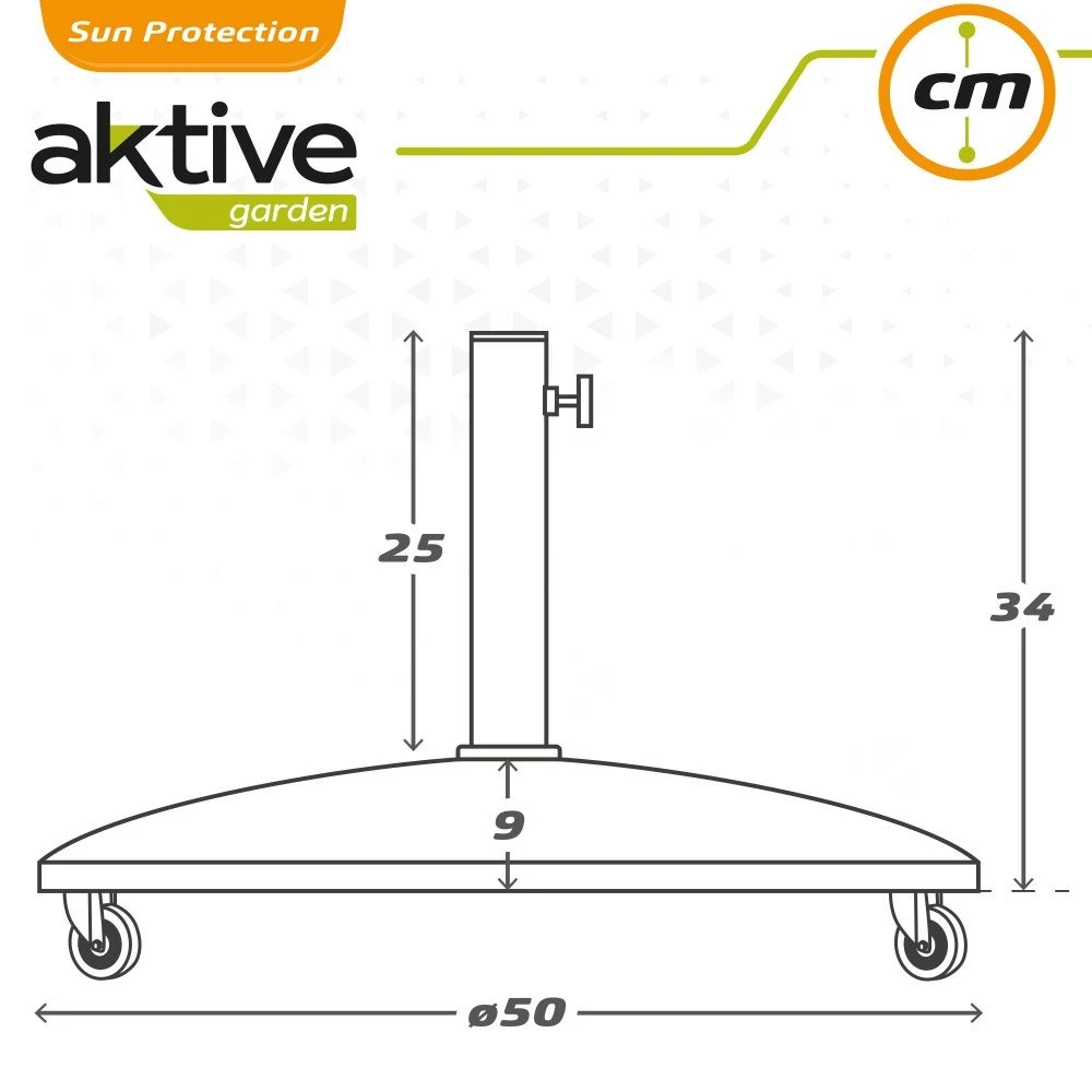 Soporte para sombrilla Aktive Garden en cemento con 4 ruedas con freno y medidas de 50 cm de diámetro y 38 cm de alto. La pieza pesa 25 kilos. El diseño es funcional e incluye tubo de acero para anclar el mástil apto para sombrillas con mástil de 35 y 48 mm, con rosca estable. Los materiales son resistentes al agua y al sol. Ideal para asegurar la estabilidad y sujeción de tu sombrilla frente al viento.