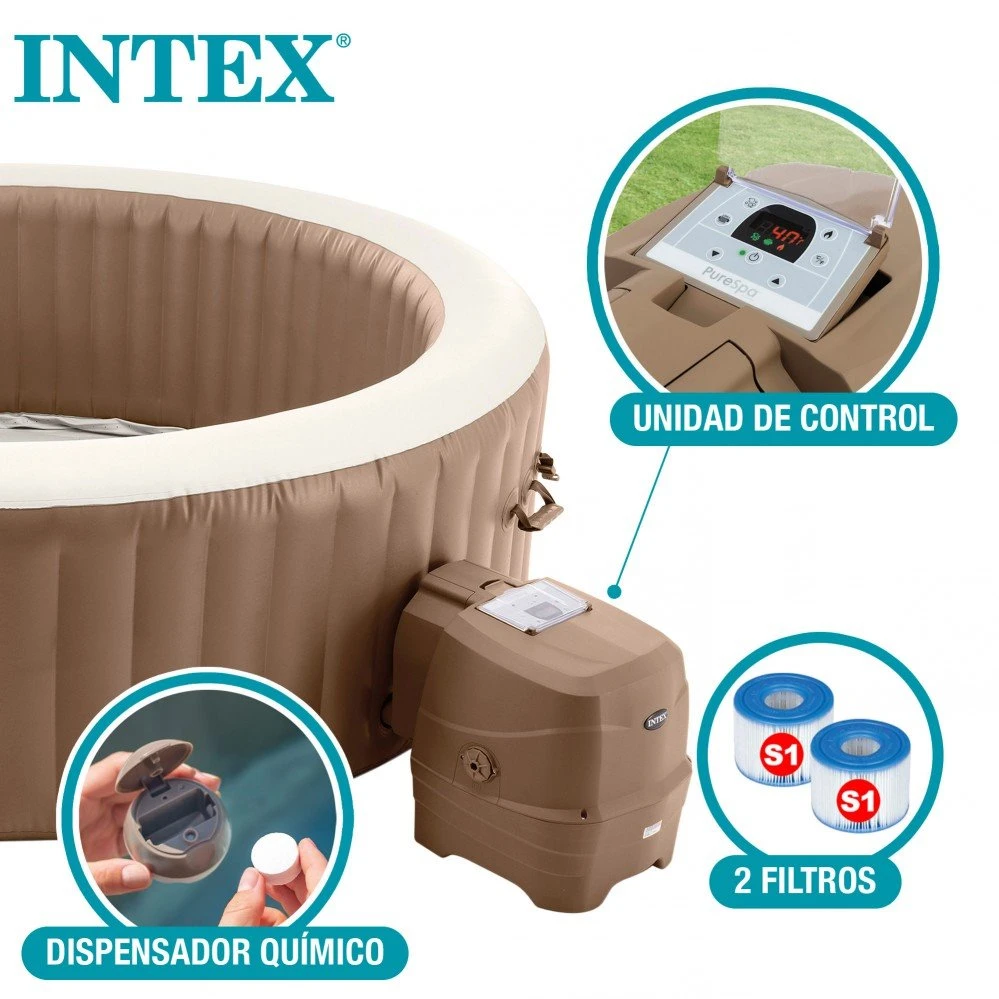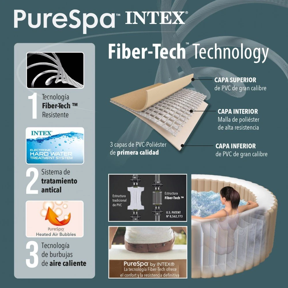 - Material: PVC laminado y lona de 3 capas, interior con FiberTech de INTEX, mayor resistencia, durabilidad y rigidez para todo el borde del spa