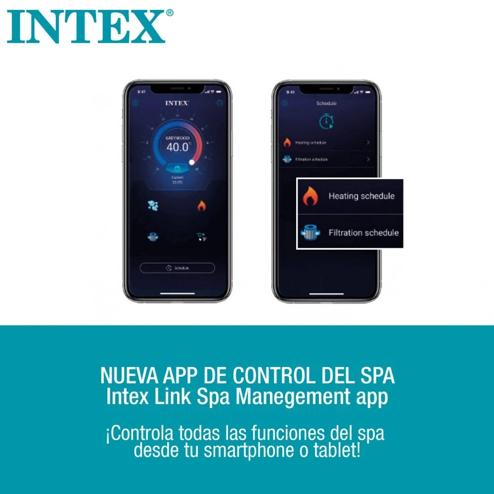 Este PureSpa octogonal INTEX dispone de burbujas con 140 salidas de aire y de 6 chorros de agua a presión. Fabricado en color negro con tejido resistente Fiber-tech que aportan mayor firmeza, estabilidad y confort. Tiene unas medidas de Ø 218 cm y una altura de 71 cm con capacidad para 1.098 litros y pensado para 6 personas. Incluye depuradora con un caudal de 1.741 l/h, sistema antical, calentador de agua (10º/40º y clorador salino. Las funciones del PureSpa se puede controlar desde el panel de control extraíble y desde la app para móvil y tablet. Los accesorios que incorpora el spa son: 2 reposacabezas, 1 cobertor de aislamiento, 1 tapiz, bolsa de transporte, 3 cartuchos de recambio S1 y tiras de verificación.