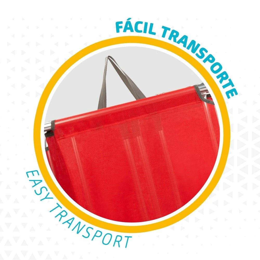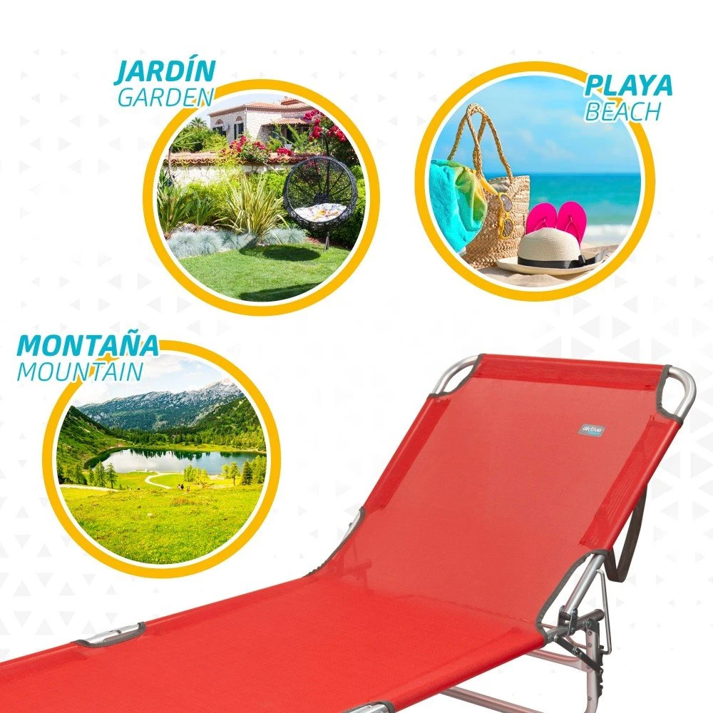 Tumbona plegable en aluminio Aktive Beach con respaldo regulable en 3 posiciones. Mide abierta 188 x 58 x 30 cm y plegada 72 x 62 cm. Tiene una estructura con tubos de 22 mm de diámetro de alta resistencia combinados con tejido de textileno en color rojo. Incluye patas con topes antivuelco y antideslizantes, ideal para arena o césped. Es ligera y de pliegue compacto, incluye 2 asas y soporta hasta 110 kg de peso.